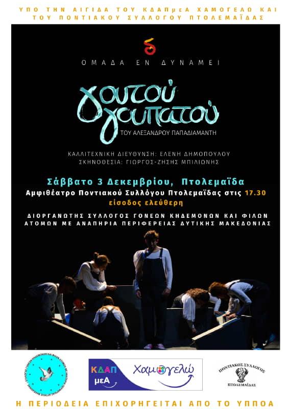 Ο Σύλλογος Γονέων, Κηδεμόνων και φίλων Ατόμων με Αναπηρία Περιφέρειας Δυτικής Μακεδονίας με αφορμή την Παγκόσμια Ημέρα Ατόμων με Αναπηρία υποδέχεται τη θεατρική ομάδα En dynamei/Εν δυνάμει και την παράσταση “ΓΟΥΤΟΥ ΓΟΥΠΑΤΟΥ” του Αλέξανδρου Παπαδιαμάντη, σε σκηνοθεσία του Γιώργου -Ζήση Μπιλιώνη και καλλιτεχνική επιμέλεια της Ελένης Δημοπούλου.
