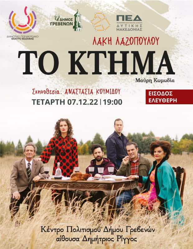 Στο πλαίσιο των Χριστουγεννιάτικων Εκδηλώσεων του Δήμου Γρεβενών, θα ανέβει την Τετάρτη 7 Δεκεμβρίου 2022 στις 19:00 στην Αίθουσα «Δημήτριος Ρίγγος» του Κέντρου Πολιτισμού του Δήμου Γρεβενών – σε συνεργασία με την ΠΕΔ Δυτικής Μακεδονίας – η εξαιρετική μαύρη κωμωδία του Λάκη Λαζόπουλου «Το Κτήμα» από το ΔΗΠΕΘΕ Κοζάνης, με ελεύθερη είσοδο.