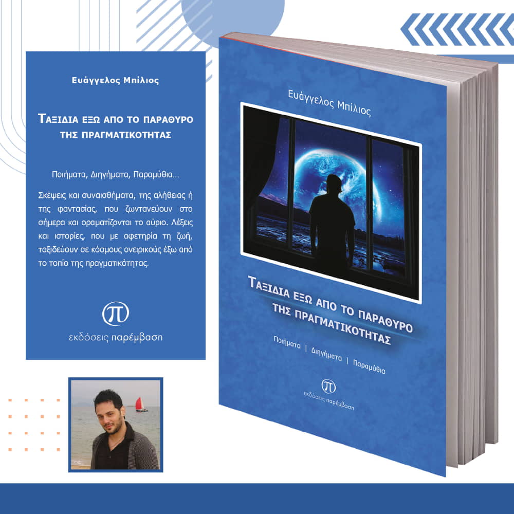 Μόλις κυκλοφόρησε το βιβλίο «Ταξίδια έξω από το παράθυρο της πραγματικότητας» του Ευάγγελου Μπίλιου από τις Εκδόσεις Παρέμβαση. Πρόκειται για ένα τρισυπόστατο βιβλίο, που το περιεχόμενό του απαρτίζουν ποιήματα, διηγήματα και παραμύθια. Κοινός νοηματικός τόπος η μετάβαση σ’ έναν κόσμο ονειρικό, μακριά από την πεζή πραγματικότητα, με σκοπό να συμπαρασύρει το αναγνωστικό κοινό στο όμορφο ταξίδι που έχει σχεδιάσει ο συγγραφέας.