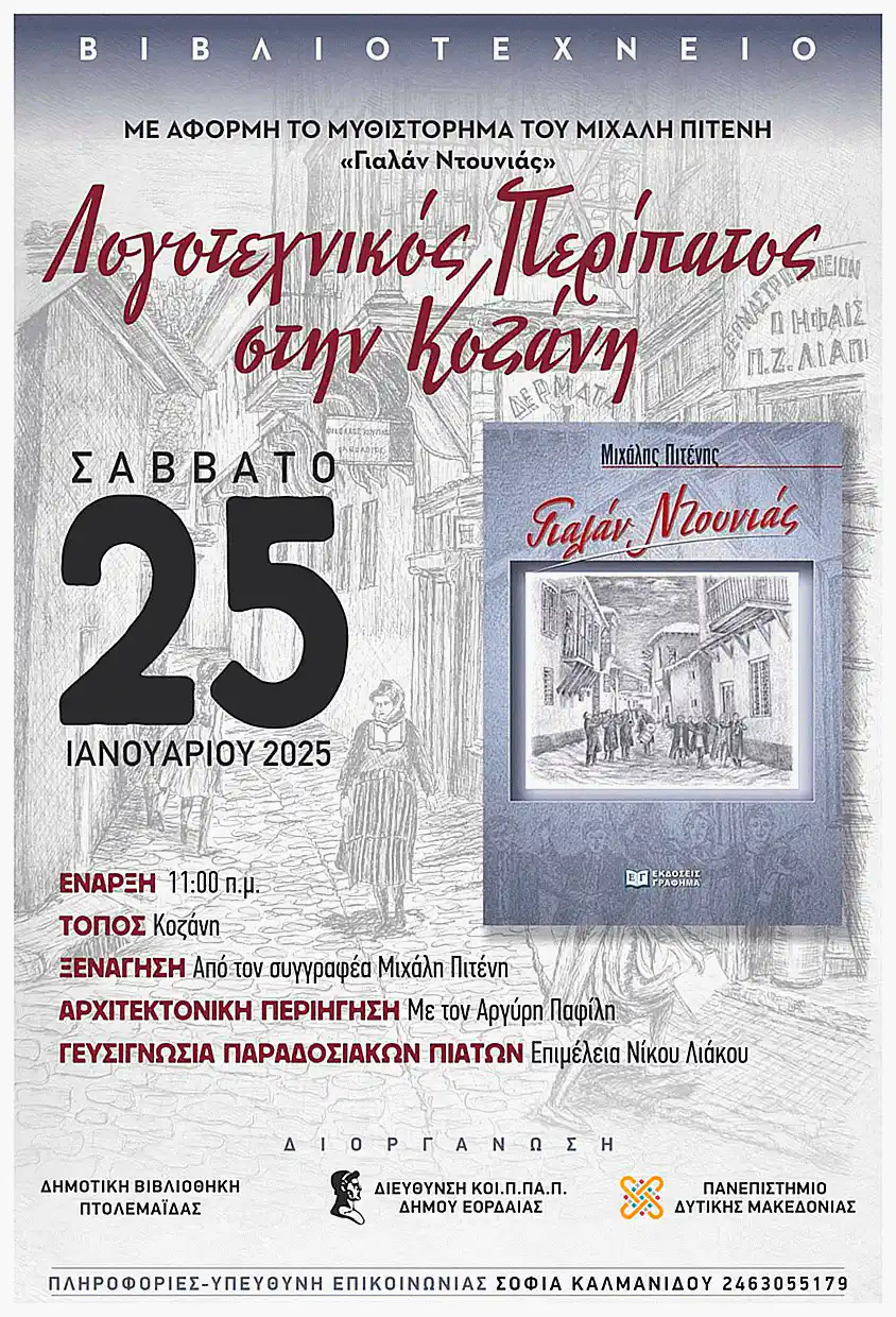 Το Βιβλιοτεχνείο σας προσκαλεί σε ένα ξεχωριστό λογοτεχνικό ταξίδι στην καρδιά της Κοζάνης, εμπνευσμένο από το μυθιστόρημα του Μιχάλη Πιτένη, «Γυαλάν Ντουνιάς».