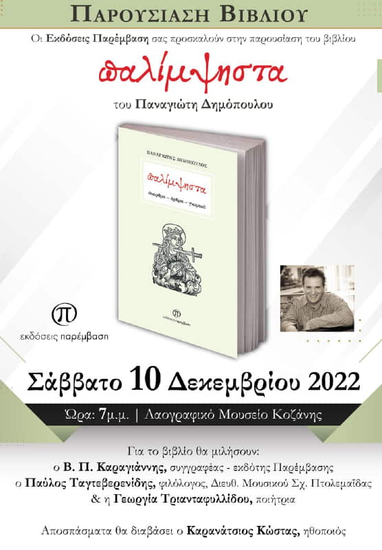 Παρουσίαση του βιβλίου «Παλίμψηστα» του Παναγιώτη Δημόπουλου, το Σάββατο 10 Δεκεμβρίου 2022 στο Λαογραφικό Μουσείο Κοζάνης