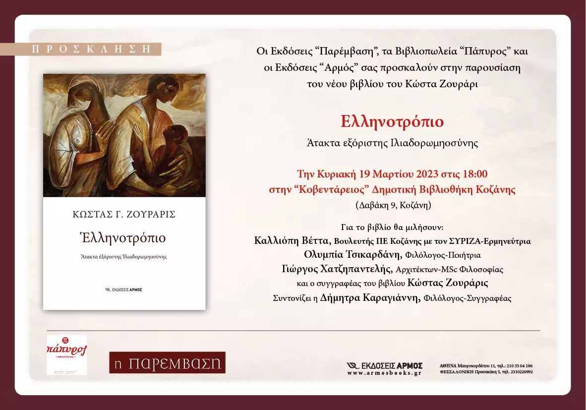 Το βιβλίο του Κώστα Γ. Ζουράρι «Ελληνοτρόπιο, Άτακτα εξόριστης Ιλιαδορωμηοσύνης», πρόκειται να παρουσιαστεί την Κυριακή 19 Μαρτίου 2023, ώρα 6 μ. μ., στην Κοβεντάρειο Δημοτική Βιβλιοθήκη Κοζάνης. Για το βιβλίο θα μιλήσουν οι: Καλλιόπη Βέτα, Βουλευτής Σύριζα Π.Ε. Κοζάνης – Ερμηνεύτρια, Ολυμπία Τσικαρδάνη, Φιλόλογος – Ποιήτρια, Γιώργος Χατζηπαντελής, Αρχιτέκτων – MSc Φιλοσοφίας και ο συγγραφέας. Την εκδήλωση συντονίζει η Δήμητρα Καραγιάννη, Φιλόλογος – Συγγραφέας.