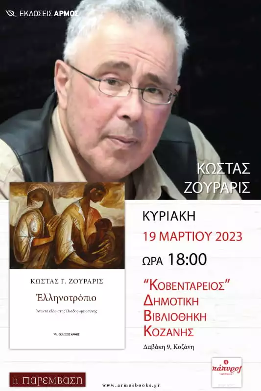Το βιβλίο του Κώστα Γ. Ζουράρι «Ελληνοτρόπιο, Άτακτα εξόριστης Ιλιαδορωμηοσύνης», πρόκειται να παρουσιαστεί την Κυριακή 19 Μαρτίου 2023, ώρα 6 μ. μ., στην Κοβεντάρειο Δημοτική Βιβλιοθήκη Κοζάνης.