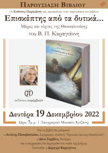 Παρουσίαση του βιβλίου «Επισκέπτης από τα Δυτικά…» του Β. Π. Καραγιάννη από τις Εκδόσεις Παρέμβαση θα πραγματοποιηθεί τη Δευτέρα 19 Δεκεμβρίου, στις 7 μ.μ., στο Λαογραφικό Μουσείο Κοζάνης.