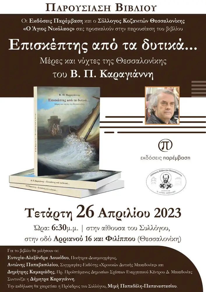 Παρουσίαση του βιβλίου «Επισκέπτης από τα Δυτικά…» του Β. Π. Καραγιάννη θα πραγματοποιηθεί την Τετάρτη 26 Απριλίου, στις 6:30 μ.μ., στην αίθουσα του Συλλόγου Κοζανιτών, στην οδό Αρριανού 16 και Φιλίππου (Θεσσαλονίκη). Η εκδήλωση διοργανώνεται από τις Εκδόσεις Παρέμβαση και τον Σύλλογο Κοζανιτών Θεσσαλονίκης «Άγιος Νικόλαος».