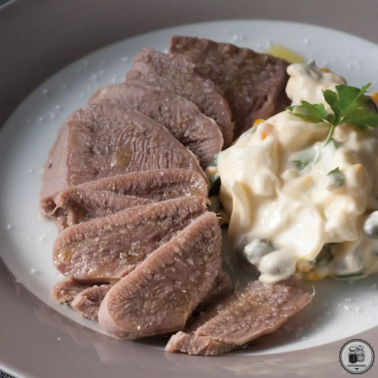 Όταν η γλώσσα κρυώσει, αφαιρούμε την λεπτή άσπρη πέτσα που την καλύπτει και την κόβουμε σε φέτες πάχους ενός εκατοστού περίπου.