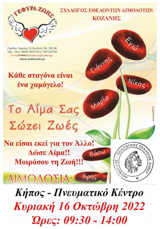 Αιμοδοσία την Κυριακή 16 Οκτωβρίου 2022 και  ΩΡΑ 09:30 -14:00 στο Πνευματικό Κέντρο (πρώην Δημοτικό Σχολείο) του Τ.Δ Κήπου,  σε συνεργασία με το Μορφωτικό –Πολιτιστικό Σύλλογο Κήπου & την Αιμοδοσία του Γ.Ν. Κοζάνης.    τηλ. για ραντεβού  Μαρίνα Καψάλη 6984856808