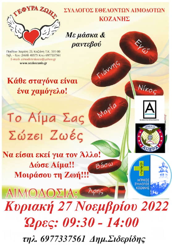Την Κυριακή 27 Νοεμβρίου αιμοδοτούμε από τις 09:30 – 14:00 στα γραφεία του Συλλόγου Αιμοδοτών, Π. Χαρίση 23, με τον Ιατρικό Σύλλογο Κοζάνης (ΙΣΚ), με τους AHEPA και τον Α.Σ. JUDO «ΑΡΙΣΤΑΡΧΟΣ» Κοζάνης και σε συνεργασία με το τμήμα αιμοδοσίας του «Μαμάτσειου» Γ.Ν. Κοζάνης