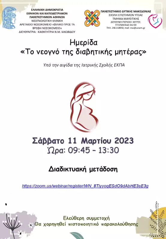 Η Νεογνολογική Κλινική του Εθνικού και Καποδιστριακού Πανεπιστημίου Αθηνών στο Αρεταίειο Νοσοκομείο και το Τμήμα Μαιευτικής της Σχολής Επιστημών Υγείας του Πανεπιστημίου Δυτικής Μακεδονίας οργανώνουν τo Webinar «Το νεογνό της διαβητικής μητέρας» που θα πραγματοποιηθεί το Σάββατο 11/03/2023 διαδικτυακά, στις 09:45 έως 13:30.