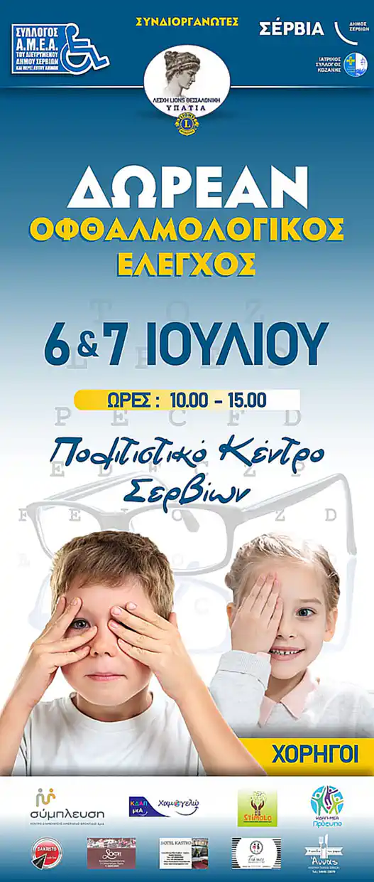 Ο Σύλλογος ΑμεΑ Σερβίων, ο Δήμος Σερβίων, ο Ιατρικός Σύλλογος Κοζάνης και η ΥΠΑΤΙΑ της Lions προσφέρουν δωρεάν οφθαλμολογικές εξετάσεις για όλους όσοι το επιθυμούν. Οι εξετάσεις θα πραγματοποιηθούν στην υπερσύγχρονη κινητή μονάδα οφθαλμολογικού ελέγχου, η οποία θα βρίσκεται στο Πολιτιστικό Κέντρο Σερβίων.