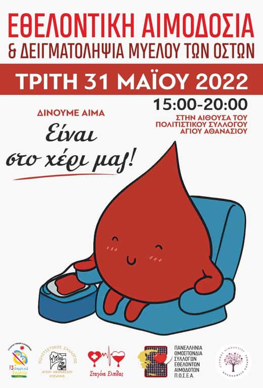 Ο Σύλλογος Γονέων Κηδεμόνων 13ου Δημοτικού Σχολείου, και ο Πολιτιστικός Σύλλογος Αγίου Αθανασίου στις 31 Μαΐου από 3 έως 8μμ στην αίθουσα του πολιτιστικού συλλόγου θα πραγματοποιήσει αιμοδοσία και δείγμα μυελού οστων.