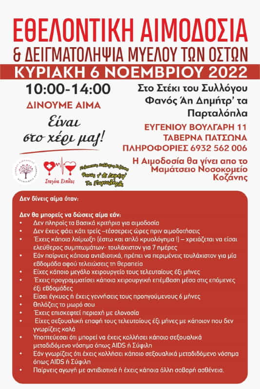 Την Κυριακή 6 Νοεμβρίου η κινητή μονάδα αιμοδοσίας του Μαμάτσιου Νοσοκομείου θα βρίσκεται στον χώρο του πολιτιστικού συλλόγου “Παρταλόπλα [δίπλα από την ταβέρνα Πλάτανος], τον Σύλλογο Σαμαριναίων Κοζάνης και τον Σύλλογο Εθελοντών Αιμοδοτών Σταγόνα Ελπίδας, για την εθελοντική αιμοδοσία .